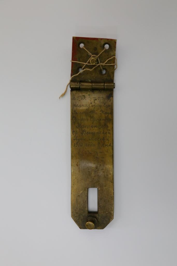 Все сундуки гвардейцев-казаков были подписными: будущий хозяин заказывал обязательную надпись с указанием названия своего полка, номера сотни, своего воинского звания, фамилии, имени, отчества и даты окончания службы. До начала XX века подписи делали путём чеканки жести по краю крышки, слева и справа от замочной петли. После 1900 года надписи стали размещать исключительно на замочной петле, которая изготавливалась «путём спайки двух латунных пластин». Слова приходилось сокращать, т.к. места на петле не хватало. Каждую букву надо было набить точками с помощью канфарника (инструмент чеканщика в виде толстой иглы или шила).