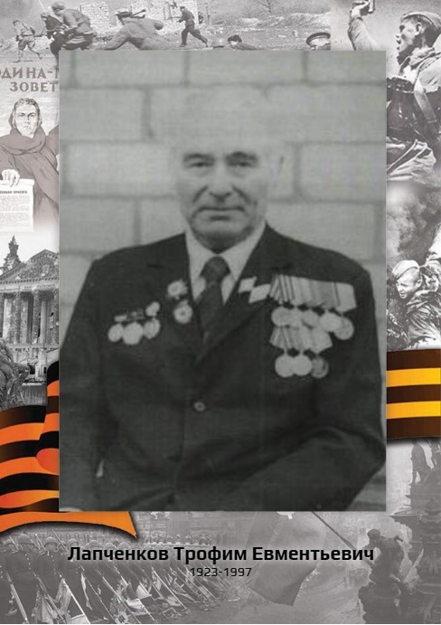 Трофим Евментьевич родился 4 июня 1923 года в хуторе Дударевском. Там же учился в школе. Ушёл воевать 23 июня 1941 года. Его направили на ускоренные танковые курсы, откуда после трёх месяцев обучения был отправлен на фронт. Боевое крещение принял под Сталинградом, потом освобождал Ростов-на-Дону. Участвовал в битве на Курской дуге. Во время боя его танк подбили, и машина загорелась. Трофим чудом спасся. Он как-то выбрался из люка, весь в крови упал на снег и потерял сознание. Очнулся на плащ-палатке и понял, что кто-то тащит его в сторону от места сражения. Это оказалась молоденькая девушка-медсестра. Трофим получил сильнейшие ожоги – обгорело практически 50% тела. Был долгий период восстановления и снова на фронт. Демобилизован 3 июля 1946 года в звании капитана.