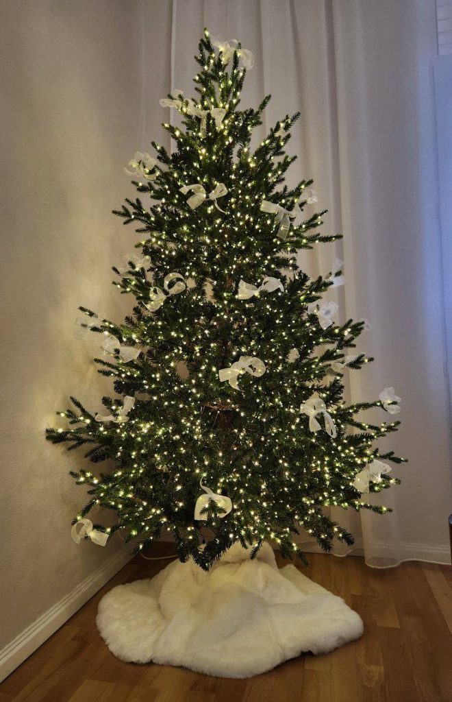 1. Первой развешивается гирлянда. Для уютной атмосферы лучше выбирать модели с тёплым жёлтым или мягким белым свечением. Располагайте гирлянды змейкой вдоль веток, начинайте от ствола, чтобы создать объём.