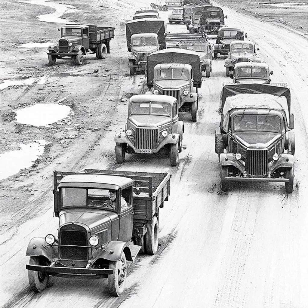 Дорога до Каменска была грейдирована и хорошо подсыпана камнем с местных разработок, тем не менее в балках и на подъёмах опытные водители надевали на задние колёса всегда лежавшие в кузове цепи. Ревя моторами и завывая коробками передач, ЗИСы и полуторки поочерёдно преодолевали эти участки. Причём застрявшим машинам в обязательном порядке помогали другие грузовики. Поэтому все машины того времени, помимо запасного колеса и цепей, в кузове имели обязательный буксирный трос. Уверенней всего на тех дорогах чувствовали себя полноприводные трёхосные американские студебекеры, доставшиеся СССР по ленд-лизу.