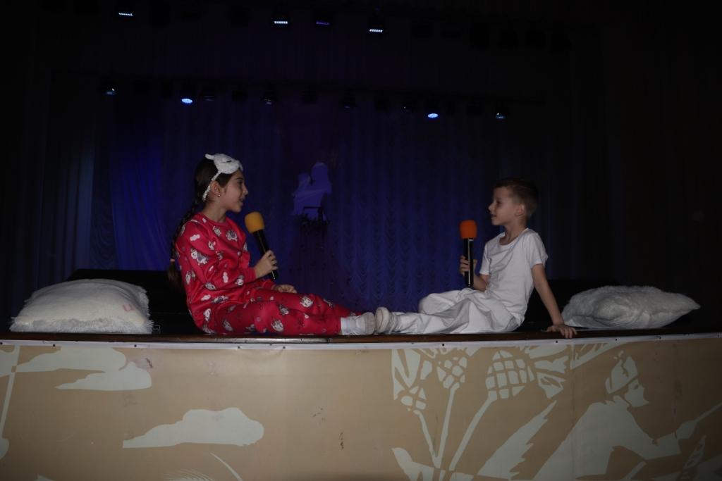 Представьте себе картину: в полной темноте брат с сестричкой в пижамах, умостившись на подушках у самого краешка сцены, вспоминают, что не приготовили для мамы подарок. За разговором засыпают. И снится им чудесный сон, что устроили они замечательный концерт-поздравление.