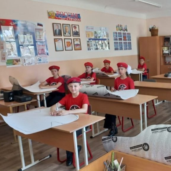 Юнармейцы отряда «Патриоты России» Шолоховской гимназии вместе с учителем технологии Валентиной Косоножкиной создают тёплые коврики для солдат. Ребята самостоятельно кроят, вырезают и шьют «пятиточники».