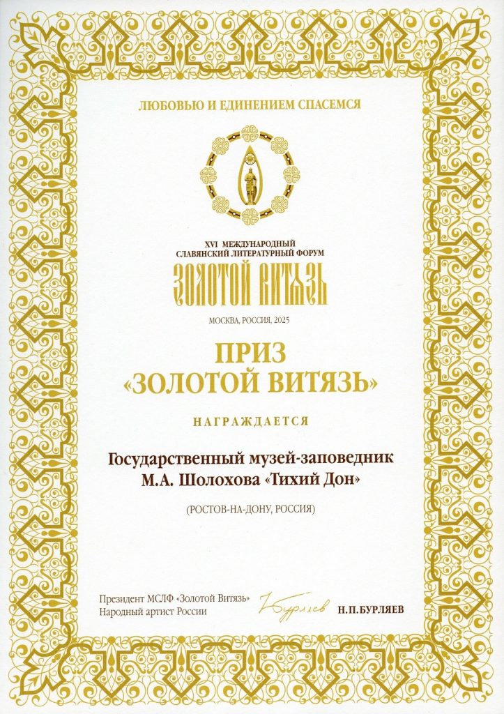 Государственный музей-заповедник награждён высшим призом «Золотой витязь» XVI Международного Славянского литературного форума «Золотой витязь» 2025 года «За бесценную лепту в дело изучения, хранения, популяризации творческого наследия М.А.Шолохова».